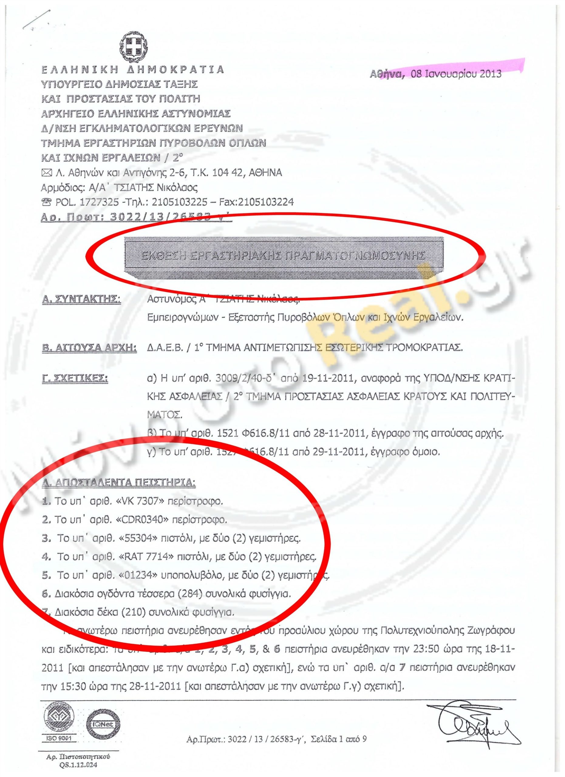 Το Real.gr φέρνει στο φως την έκθεση πραγματογνωμοσύνης της ΕΛ.ΑΣ. για τα όπλα, που είχαν βρεθεί θαμμένα στην Πολυτεχνειούπολη Ζωγράφου το 2011 και τους γεμιστήρες, σε έναν εκ των οποίων είχε εντοπιστεί «μέρος μη πλήρους DNA» της Ηριάννας Β.Λ. που καταδικάστηκε τον περασμένο Ιούνιο σε κάθειρξη 13 ετών ως μέλος της τρομοκρατικής «Συνωμοσία Πυρήνων της Φωτιάς».