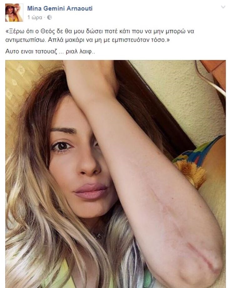 “Ξέρω ότι ο Θεός δεν θα μου δώσει ποτέ κάτι που να μην μπορώ να αντιμετωπίσω. Απλά μακάρι να μην με εμπιστευόταν τόσο. Αυτό είναι τατουάζ … ριαλ λαιφ..” έγραψε η Μίνα Αρναούτη.