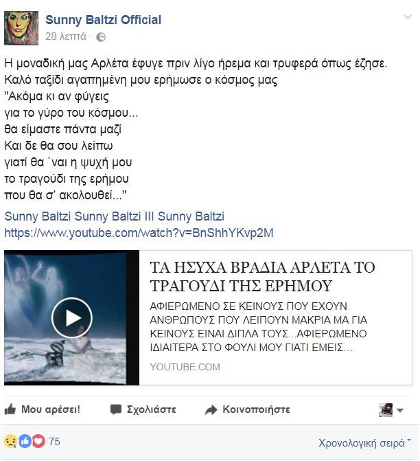 Τη δυσάρεστη είδηση έκανε γνωστή μέσα από τον προσωπικό της λογαριασμό στο facebook η τραγουδίστρια και μουσικοσυνθέτης Σάννυ Μπαλτζή. Συγκεκριμένα έγραψε: “Η μοναδική μας Αρλέτα έφυγε πριν λίγο ήρεμα και τρυφερά όπως έζησε. Καλό ταξίδι αγαπημένη μου ερήμωσε ο κόσμος μας”.
