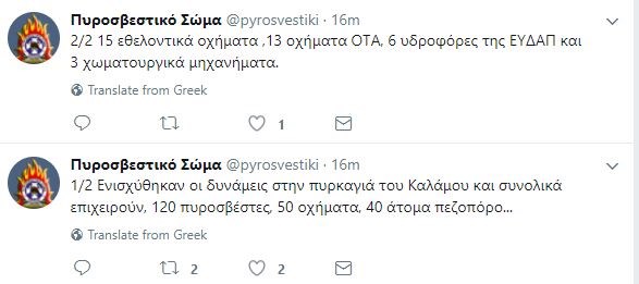 Σύμφωνα με την ενημέρωση της Πυροσβεστικής, στον Κάλαμο επιχειρούν, πλέον, 120 πυροσβέστες με 50 οχήματα, 40 άτομα πεζοπόρο τμήμα, ενώ υπάρχουν ακόμη 15 οχήματα εθελοντών, 13 οχήματα από τους ΟΤΑ, 6 υδροφόρες της ΕΥΔΑΠ και 3 χωματουργικά μηχανήματα, προκειμένου να δημιουργήσουν αντιπυρικές ζώνες. Δείτε τα tweets της Πυροσβεστικής:
