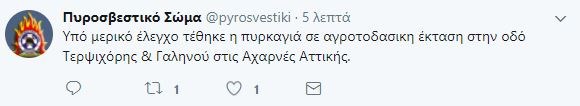 Πρόκειται για τη φωτιά που ξέσπασε σε αγροτοδασικη έκταση στην οδό Τερψιχόρης και Γαληνού.
