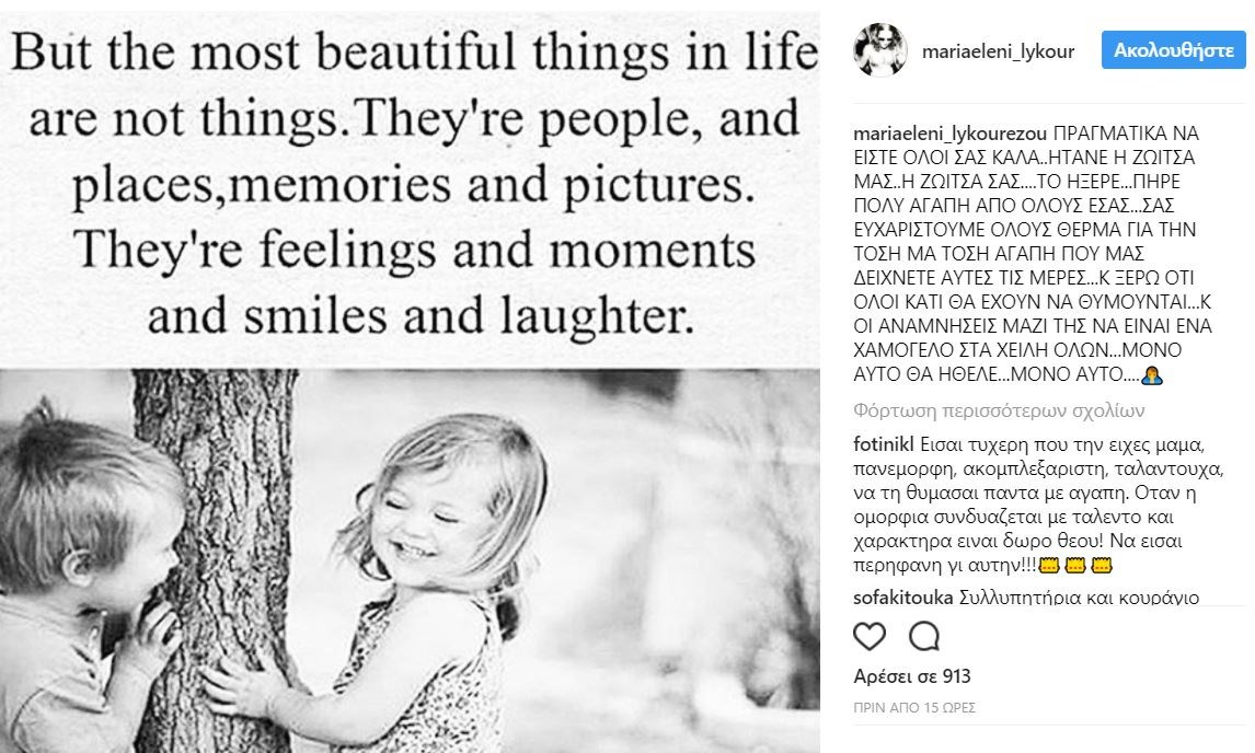 Η Μαρία-Ελένη Λυκουρέζου συνόδευσε τη φωτογραφία με το σχόλιο: “Πραγματικά να είστε όλοι σας καλά… Ήταν η Ζωίτσα μας… Η Ζωίτσα σας… Το ήξερε… Πήρε πολύ αγάπη από όλους εσάς… Σας ευχαριστούμε όλους θερμά για την τόση μα τόση αγάπη που μας δείχνετε αυτές τις μέρες… Και ξέρω ότι όλοι κάτι θα έχουν να θυμούνται… Και οι αναμνήσεις μαζί της να είναι ένα χαμόγελο στα χείλη όλων… Μόνο αυτό θα ήθελε… Μόνο αυτό”.