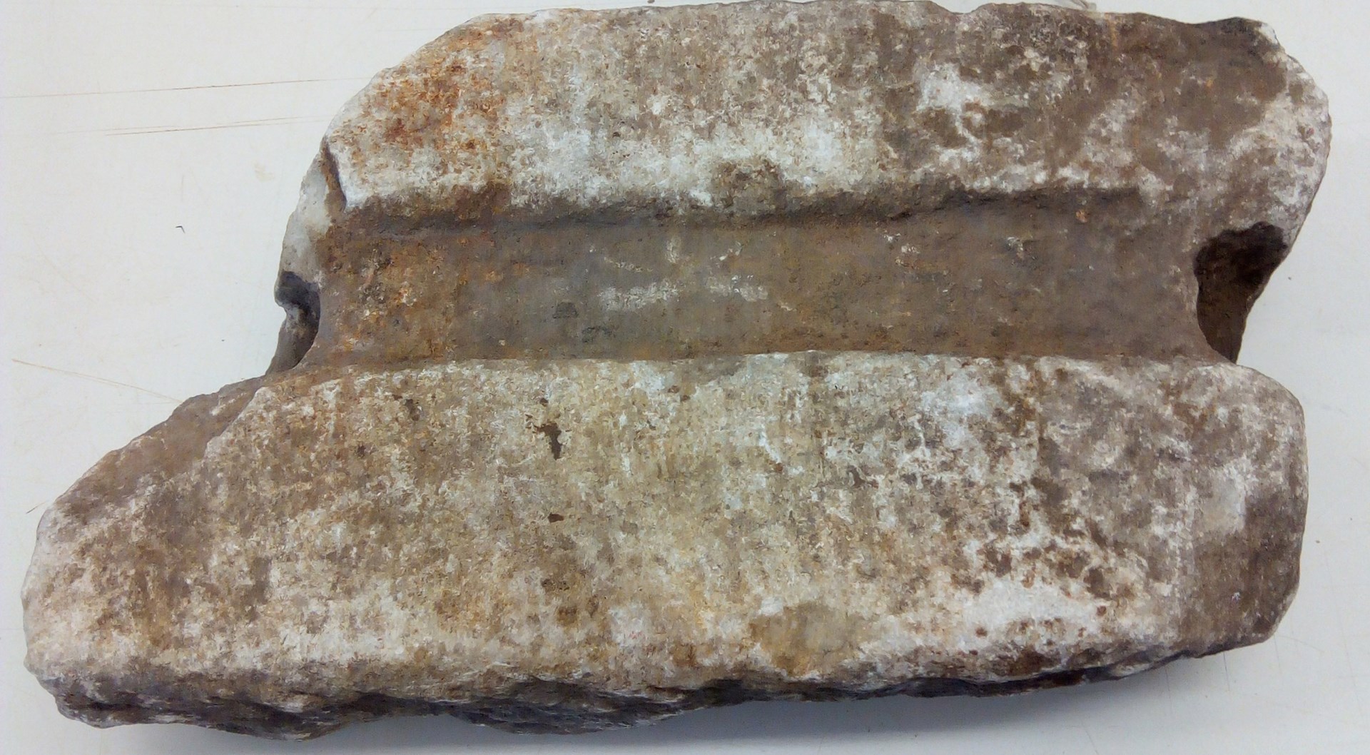 Η άνω επιφάνειά του είναι επεξεργασμένη και στο μέσον της σχηματίζεται αβαθής αύλακα, πλάτους 0,057 μ, για τη ροή του νερού. Η διαμόρφωση κυκλοτερών βαθύνσεων στα δύο του άκρα, πιθανόν για την τοποθέτηση συνδέσμων, ίσως αποτελεί ένδειξη ότι το θραύσμα αυτό είχε επαναχρησιμοποιηθεί κατά το παρελθόν.