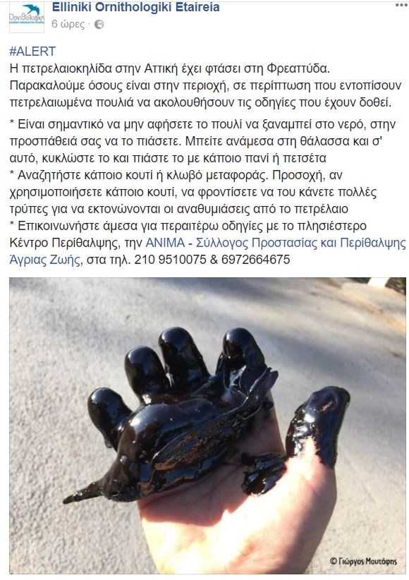 Η Ελληνική Ορνιθολογική Εταιρεία έδωσε οδηγίες σε όσους είναι στην περιοχή, σε περίπτωση που εντοπίσουν πουλιά καλυμμένα με πετρέλαιο.