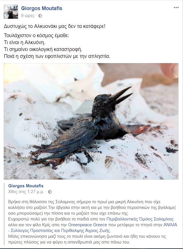 «Βρήκα στη θάλασσα της Σαλαμίνας το πρωί μια μικρή αλκυόνη που είχε κολλήσει στο μαζούτ. Την έβγαλα στην ακτή και με την βοήθεια περαστικών της βγάλαμε (όσο μπορούσαμε) την πίσσα και το μαζούτ που είχε επάνω της», έγραψε στο Facebook.