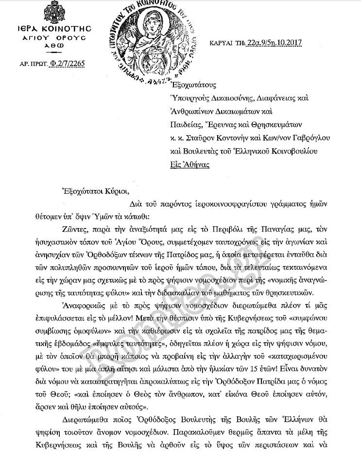 Οι Αντιπρόσωποι και Προϊστάμενοι των Είκοσι Ιερών Μονών του Αγίου Όρους στην επιστολή τους, “συμμετέχουν στην αγωνία και ανησυχία των Ορθοδόξων τέκνων της Πατρίδος μας, για τα τελευταία τεκταινόμενα που αφορούν το νομοσχέδιο περί της νομικής αναγνώρισης της ταυτότητας του φύλου“.