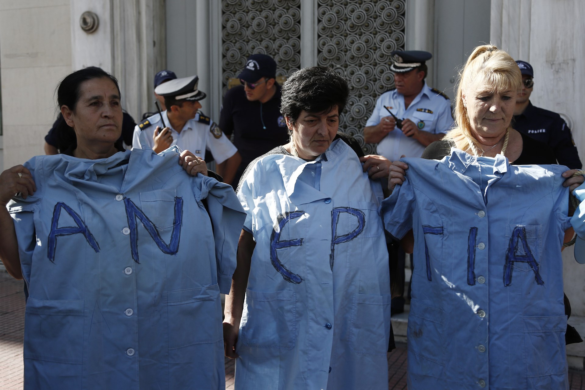 Οι εργαζόμενοι στα δημόσια νοσοκομεία όταν έφτασαν έξω από το Γενικό Λογιστήριο του κράτους όπου κρατώντας στα χέρια τους τις ρόμπες που φορούν στο νοσοκομείο τους έβαλαν φωτιά και τις έκαψαν.