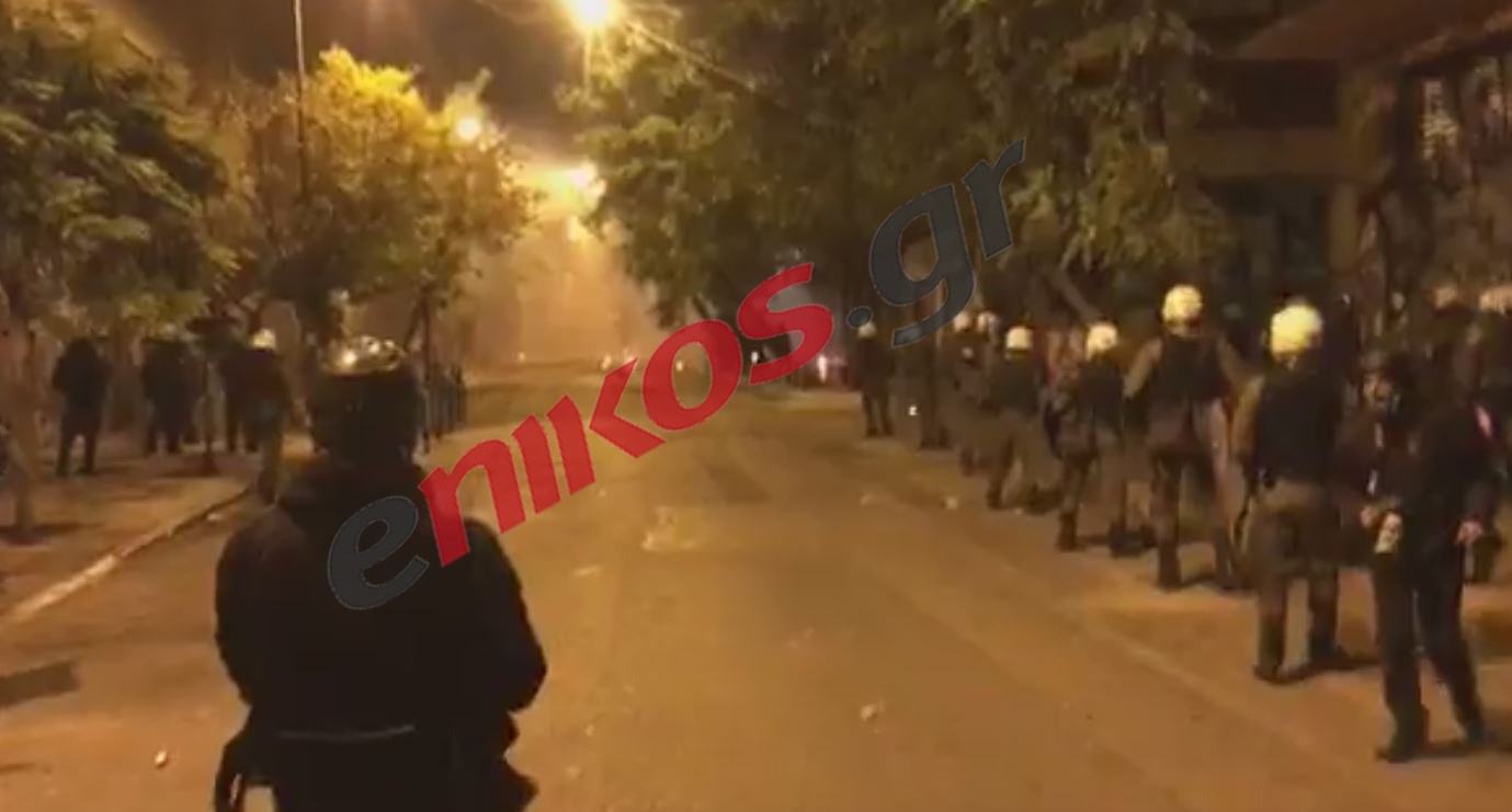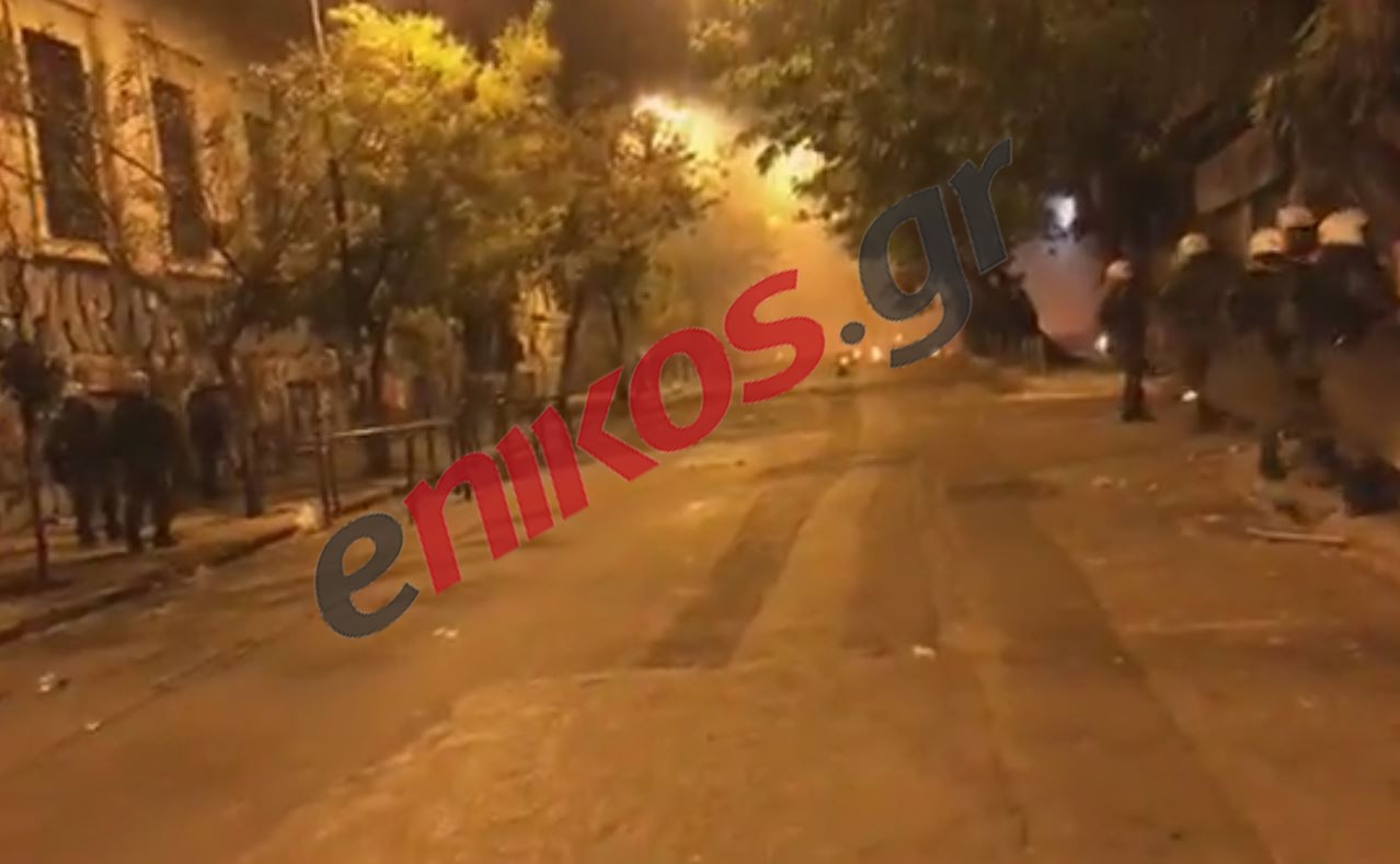 Την ίδια στιγμή στο δρόμο υπάρχουν εστίες φωτιών που έχουν δημιουργηθεί από τη ρίψη των μολότοφ.