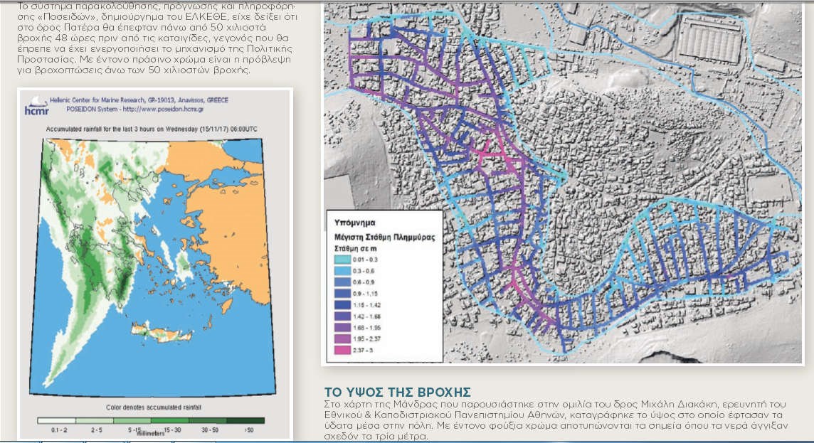 Σύμφωνα με τον ομότιμο καθηγητή Γεωλογίας του ΕΚΠΑ, Δημήτρη Παπανικολάου, το Σύστημα Παρακολούθησης, πρόγνωσης και πληροφόρησης «Ποσειδών», δημιούργημα του ΕΛΚΕΘΕ, είχε δείξει ότι στο όρος Πατέρα θα έπεφταν πάνω από 50 χιλιοστά βροχής 48 ώρες πριν από τις καταιγίδες, γεγονός που θα έπρεπε να έχει ενεργοποιήσει το μηχανισμό της Πολιτικής Προστασίας.