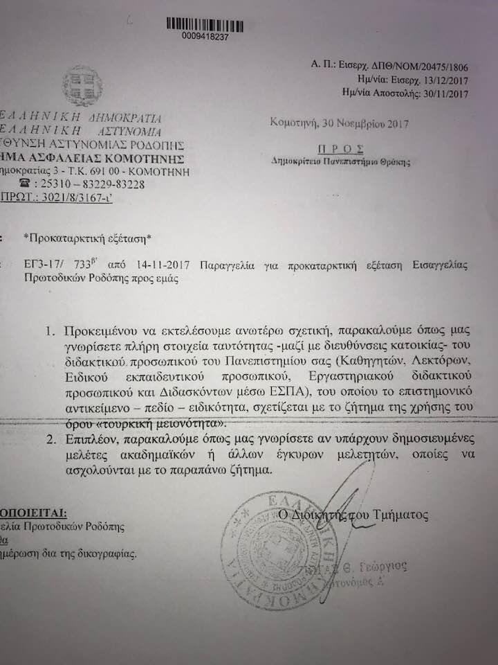 Σάλος έχει προκληθεί στη Ροδόπη με την ασφάλεια Κομοτηνής που ζητά, κατόπιν εισαγγελικής παραγγελίας, εγγράφως από το Δημοκρίτειο Πανεπιστήμιο Θράκης τα πλήρη στοιχεία ταυτότητας μαζί με διευθύνσεις κατοικίαςτου διδακτικού προσωπικού του Ιδρύματος, του οποίου το επιστημονικό αντικείμενο-πεδίο-ειδικότητα, σχετίζεται με το ζήτημα της χρήσης του όρου “τουρκική μειονότητα”.