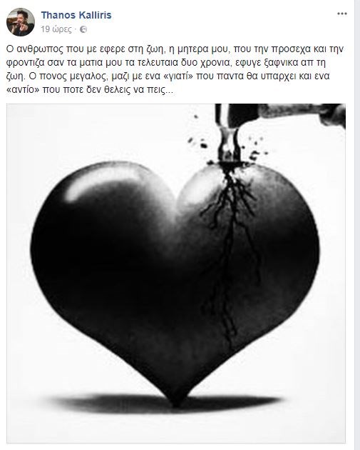 “Ο άνθρωπος που με έφερε στη ζωή, η μητέρα μου, που την πρόσεχα και την φρόντιζα σαν τα μάτια μου τα τελευταία δυο χρόνια, έφυγε ξαφνικά από τη ζωή. Ο πόνος μεγάλος, μαζί με ένα «γιατί» που πάντα θα υπάρχει και ένα «αντίο» που πότε δεν θέλεις να πεις…”, έγραψε χαρακτηριστικά.
