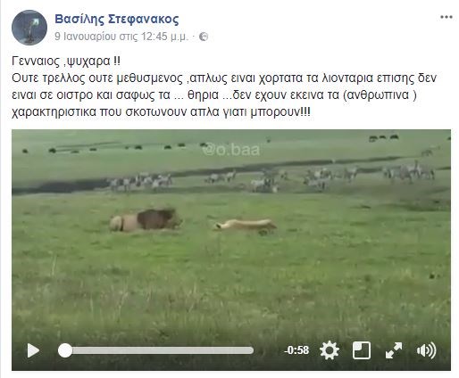 Ο 57χρονος πρώην βαρυποινίτης, ο οποίος είχε πρωταγωνιστήσει στο χώρο της νύχτας τις τελευταίες δεκαετίες, πριν από λίγες ημέρες είχε ανεβάσει ένα βίντεο στον προσωπικό του λογαριασμό στο Facebook, και έγραψε χαρακτηριστικά: «Γενναίος, ψυχάρα !! Ούτε τρελός ούτε μεθυσμένος, απλώς είναι χορτάτα τα λιοντάρια επίσης δεν είναι σε οίστρο και σαφώς τα … θηρία …δεν έχουν εκείνα τα (ανθρώπινα ) χαρακτηριστικά που σκοτώνουν απλά γιατί μπορούν!!!»