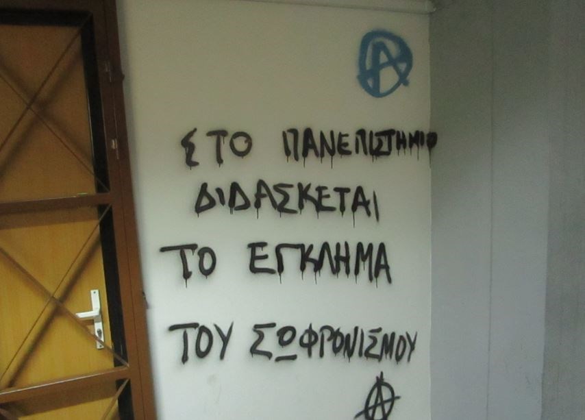 Παρέμβαση στο κτίριο της Νομικής του ΑΠΘ και συγκεκριμένα στην αίθουσα, όπου διδάσκεται το μάθημα της Σωφρονιστικής πραγματοποίησε την Τετάρτη (21/2) ομάδα αντιεξουσιαστών.