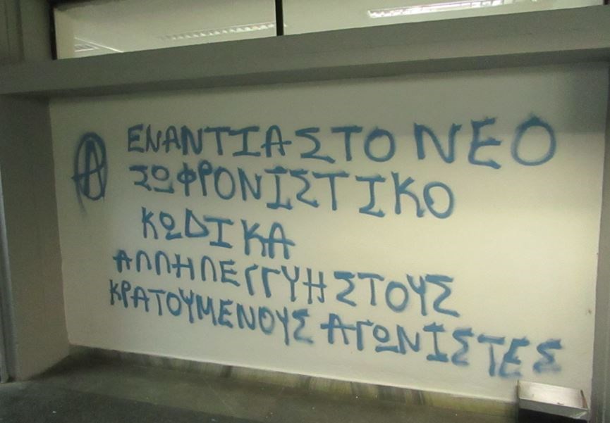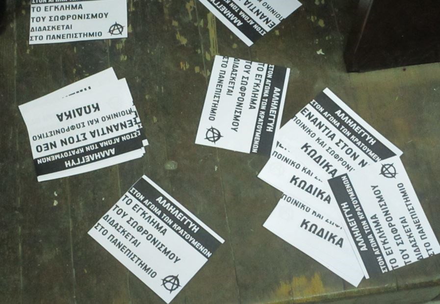 Όπως αναφέρεται σε δημοσίευμα σε ιστοσελίδα του αντιεξουσιαστικού χώρου, «την Τετάρτη 21 Φεβρουαρίου επιλέξαμε να παρέμβουμε στο κτίριο της Νομικής και συγκεκριμένα στην αίθουσα όπου διδάσκεται το μάθημα της Σωφρονιστικής, στέλνοντας ένα ελάχιστο μήνυμα αλληλεγγύης στους εκατοντάδες κρατούμενους και κρατούμενες που βιώνουν καθημερινά την συνθήκη του εγκλεισμού και τη φρικαλαιότητα που ακούει στο όνομα σωφρονισμός μέσα από τα κολαστήρια της δημοκρατίας».