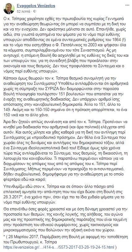 Συγκεκριμένα ο κ. Βενιζέλος, αναφέρει στην ανάρτησή του: