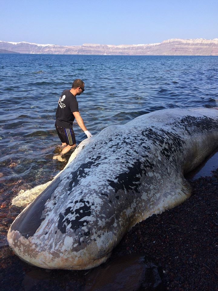 Μία νεκρή φάλαινα μήκους 9 μέτρων (Sperm whale) ξεβράστηκε στην περιοχή του Ακρωτηρίου, δίπλα στον ύφαλο “Αδιάβατος” που βρίσκεται στην πλευρά της Καλντέρας, στη Σαντορίνη.