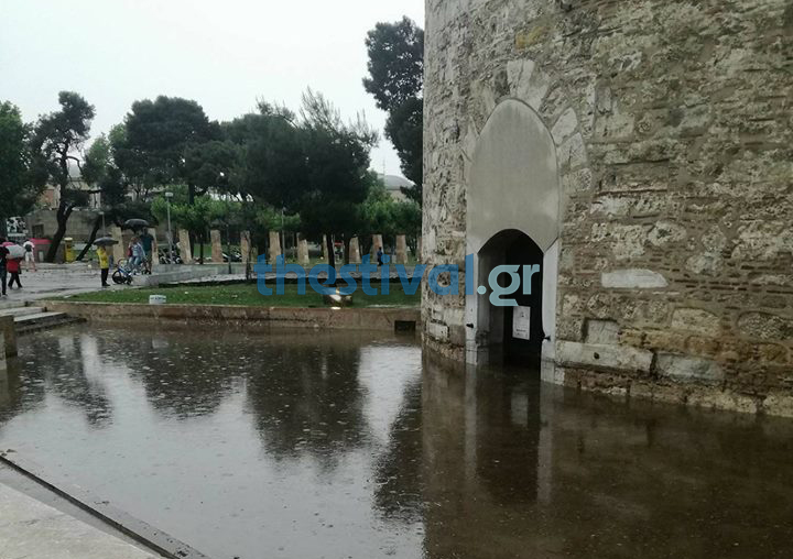 Πλημμυρισμένη παραμένει εδώ και αρκετή ώρα η ευρύτερη περιοχή του μνημείου του Λευκού Πύργου στο κέντρο της Θεσσαλονίκης.