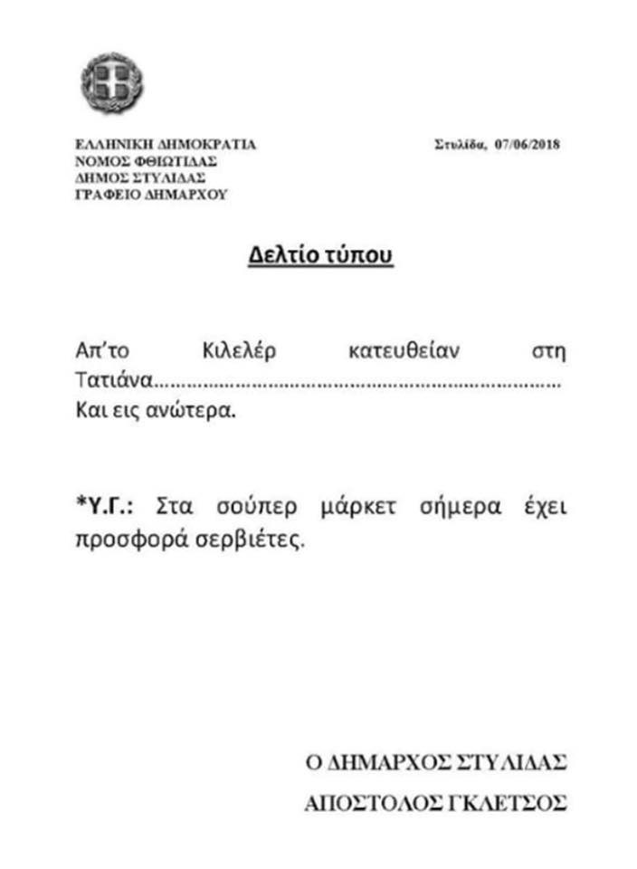 Ο αγρότης κατήγγειλε τον δήμαρχο Στυλίδας ότι του έριξε δύο μπουνιές. O Απόστολος Γκλέτσος έδωσε τη δική του απάντηση. Όπως αναφέρει «Απ΄το Κιλελέρ κατευθείαν στην Τατιάνα. Και εις ανώτερα. ΥΓ: Στα σούπερ μάρκετ σήμερα έχει προσφορά σερβιέτες.