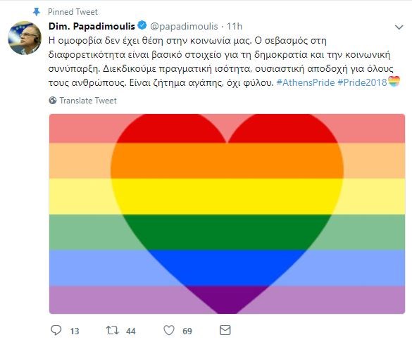 “Η καταπολέμηση κάθε διάκρισης είναι προϋπόθεση ισονομίας και βάση για τη δημιουργία μιας κοινωνίας προόδου και ευημερίας. #athenspride2018 “.