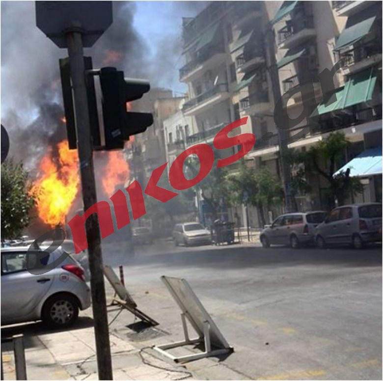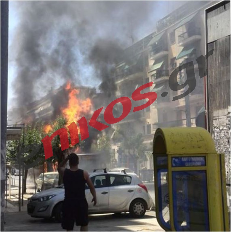Είναι η στιγμή που το αστικό λεωφορείο έχει τυλιχθεί στις φλόγες, στην διασταύρωση των οδών Νιρβάνα και Αργυροπούλου, στα Κάτω Πατήσια.