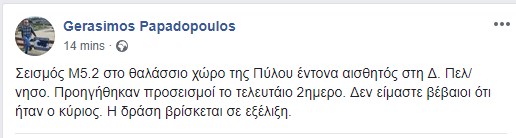 “Ο σεισμός ήταν 5.2 ρίχτερ στον θαλάσσιο χώρο της Πύλου και έγινε έντονα αισθητός στη Δυτική Πελοπόννησο. Προηγήθηκαν προσεισμοί το τελευταίο διημερο. Δεν είμαστε βέβαιοι ότι ήταν ο κύριος σεισμός. Η δράση βρίσκεται σε εξέλιξη” έγραψε στον προσωπικό του λογαριασμό στο facebook.