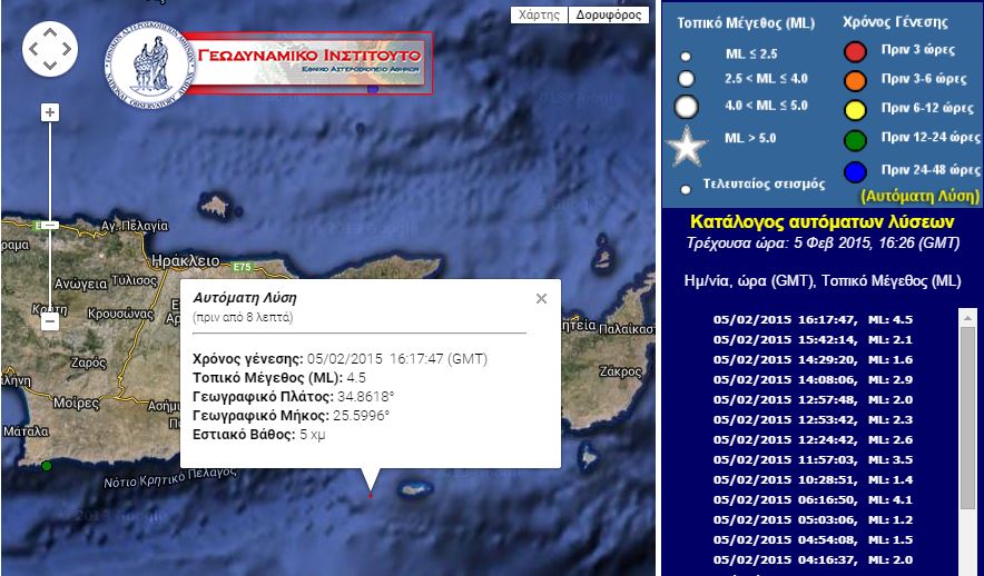 Σύμφωνα με την προκαταρκτική μέτρηση του γεωδυναμικού Ινστιτούτου ο σεισμός των 4,5 Ρίχτερ εκδηλώθηκε στις 18:17 στο θαλάσσιο χώρο νότια της Κρήτης.