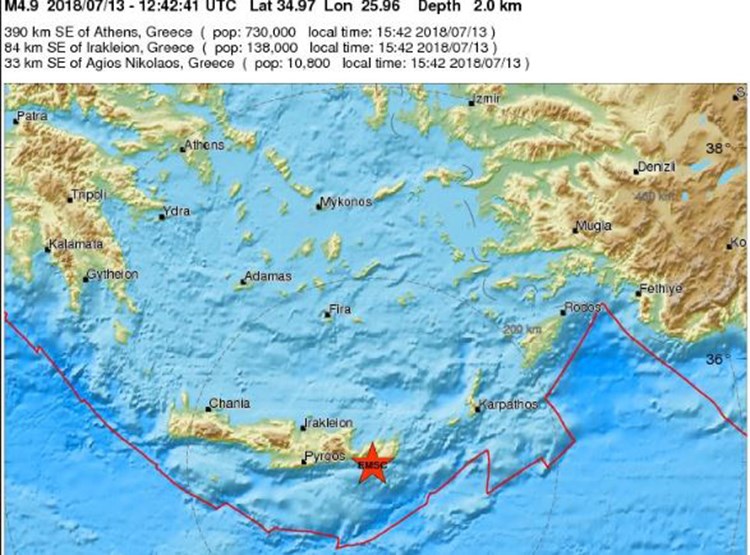 Για σεισμό μεγέθους 4,9 βαθμών της κλίμακας Ρίχτερ στην Κρήτη κάνει λόγο αυτή την ώρα το Ευρωμεσογειακό, το οποίο στην αυτόματη, προκαταρκτική του λύση αναφέρει πως το εστιακό βάθος του σεισμού εντοπίζεται στα δύο χιλιόμετρα.Όσο για το επίκεντρο του, σύμφωνα με το «Emsc» εντοπίζεται στα 33 χιλιόμετρα νοτιοανατολικά του Αγίου Νικολάου και στα 84 χιλιόμετρα του Ηρακλείου.Δείτε τη φωτογραφία: