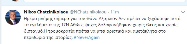 “Ημέρα μνήμης σήμερα για τον Θάνο Αξαρλιάν. Δεν πρέπει να ξεχάσουμε ποτέ τα εγκλήματα της 17Ν. Αθώες ψυχές δολοφονήθηκαν χωρίς έλεος και χωρίς δισταγμό. Η τρομοκρατία πρέπει να μπει οριστικά και αμετάκλητα στο περιθώριο της ιστορίας”, έγραψε ο Νίκος Χατζηνικολάου.
