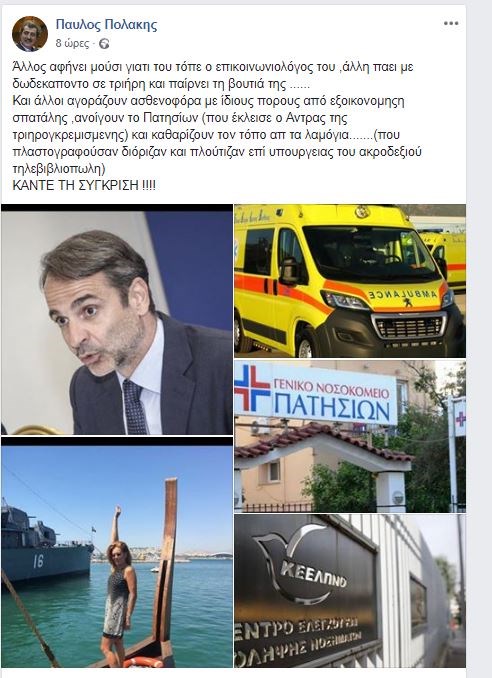 “Άλλος αφήνει μούσι γιατί του το είπε ο επικοινωνιολόγος του,άλλη πάει με δωδεκάποντο σε τριήρη και παίρνει τη βουτιά της …Και άλλοι αγοράζουν ασθενοφόρα με ίδιους πόρους από εξοικονόμηση σπατάλης ,ανοίγουν το Πατησίων (που έκλεισε ο Άντρας της τριηρογκρεμισμένης) και καθαρίζουν τον τόπο απ τα λαμόγια…….(που πλαστογραφούσαν διόριζαν και πλούτιζαν επί υπουργίας του ακροδεξιού τηλεβιβλιοπωλή)