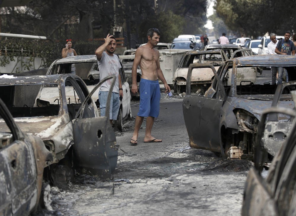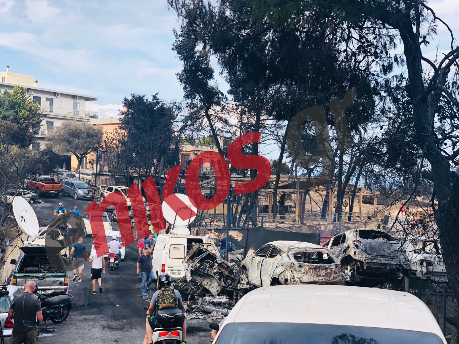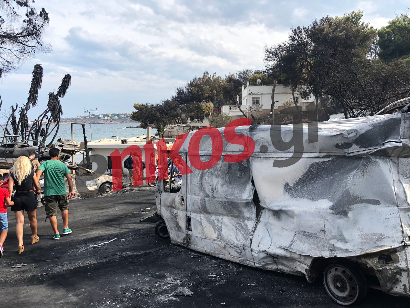 Ο κεντρικός δρόμος στο Μάτι μοιάζει με σκηνικό Αποκάλυψης καθώς όλα έχουν μετατραπεί σε στάχτες. Συγκλονιστικές είναι και οι μαρτυρίες των κατοίκων που είδαν ζωές και περιουσίες να χάνονται στις φλόγες.