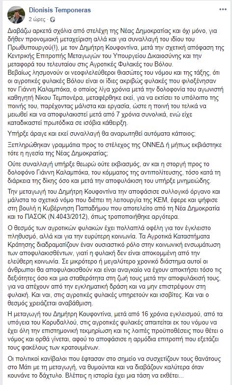 Ο Διονύσης Τεμπονέρας, γιος του δολοφονηθέντα καθηγητή Νίκου Τεμπονέρα, με ανάρτησή του στο Facebook σχολίασε τα όσα αναφέρουν στελέχη της Νέας Δημοκρατίας αναφορικά με τη μεταγωγή του Δημήτρη Κουφοντίνα στις αγροτικές φυλακές Βόλου.