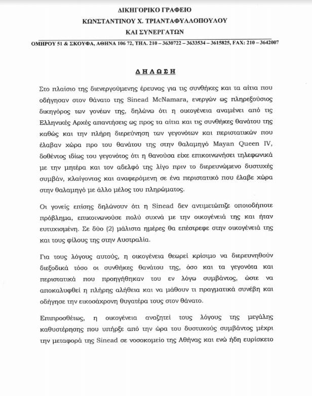 «Στο πλαίσιο της διενεργούμενης έρευνας για τις συνθήκες και τα αίτια που οδήγησαν στον θάνατο της Sinead McNamara, ενεργών ως πληρεξούσιος δικηγόρος των γονέων της, δηλώνω ότι η οικογένεια αναμένεται από τις ελληνικές αρχές απαντήσεις ως προς τα αίτια και τις συνθήκες θανάτου της, καθώς και την πλήρη διερεύνηση των γεγονότων και περιστατικών που έλαβαν χώρα προ του θανάτου της στη θαλαμηγό Mayan Queen IV, δοθέντος ιδίως του γεγονότος ότι η θανούσα είχε επικοινωνήσει τηλεφωνικά με την μητέρα και τον αδελφό της λίγο πριν από το διερευνώμενο δυστυχές συμβάν, κλαίγοντας και αναφερόμενη σε ένα περιστατικό που έλαβε χώρα στη θαλαμηγό με άλλο μέλος του πληρώματος» αναφέρει ο Χαράλαμπος Τριανταφυλλόπουλος.