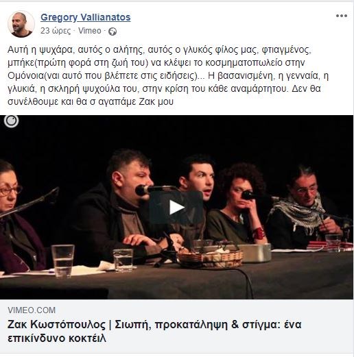 «Αυτή η ψυχάρα, αυτός ο αλήτης, αυτός ο γλυκός φίλος μας, φτιαγμένος, μπήκε (πρώτη φορά στη ζωή του) να κλέψει το κοσμηματοπωλείο στην Ομόνοια (ναι αυτό που βλέπετε στις ειδήσεις)… Η βασανισμένη, η γενναία, η γλυκιά, η σκληρή ψυχούλα του, στην κρίση του κάθε αναμάρτητου. Δεν θα συνέλθουμε και θα σ’ αγαπάμε Ζακ μου» είχε γράψει χθες στο Facebook για τον θάνατό του, ο Γρηγόρης Βαλλιανάτος.