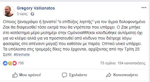Συγκεκριμένα, ο Γρηγόρης Βαλλιανάτος αναφέρει: «Όποιος ξαναγράψει ή ξαναπεί “ο επίδοξος ληστής” για τον άγρια δολοφονημένο Ζακ θα διαψευσθεί τόσο οικτρά που θα ντρέπεται που υπάρχει. O Zακ μπήκε στο κατάστημα μέρα μεσημέρι στην Ομόνοια!!!!!(και κλειδώθηκε αυτόματα) όχι για να κλέψει αλλά για να προστατευθεί από κίνδυνο που διέτρεχε λόγω φασαρίας στο απέναντι μαγαζί που καθόταν με παρέα. Οπτικό υλικό υπάρχει. Τα υπόλοιπα στις τρομερές δίκες που έρχονται, αρχίζοντας από την Τρίτη 25 Σεπτεμβρίου”.
