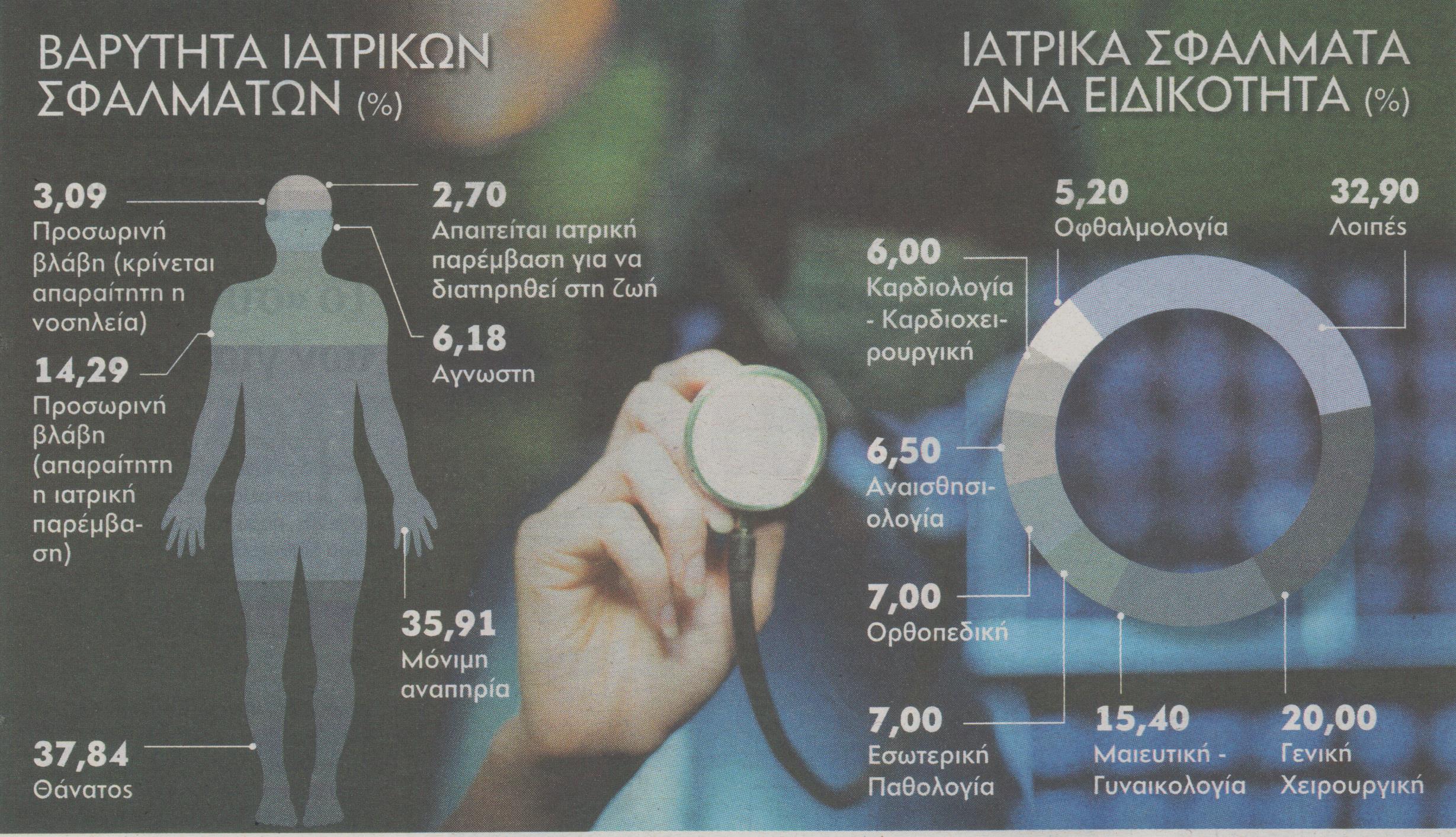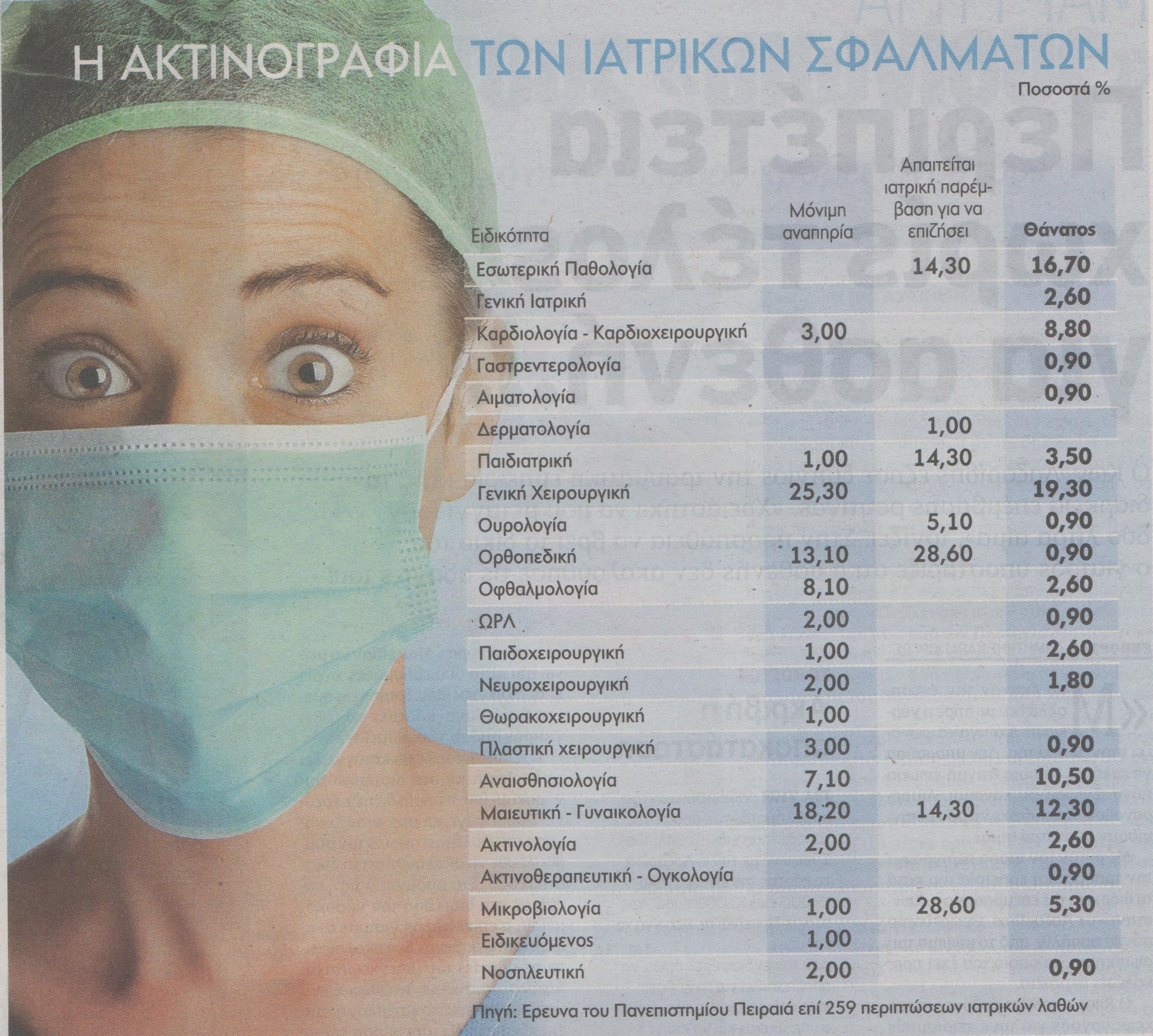 Έρευνα του πανεπιστημίου Πειραιά επί 259 περιπτώσεων ιατρικών σφαλμάτων καταγράφει τόσο τη βαρύτητα των ιατρικών λαθών -το 35,9% από αυτά προκαλεί μόνιμες αναπηρίες-, ενώ μεγάλο ενδιαφέρον παρουσιάζει η καταγραφή των σφαλμάτων ανά ειδικότητα, όπου τα σκήπτρα κρατούν χειρουργοί, μαιευτήρες και ορθοπεδικοί.