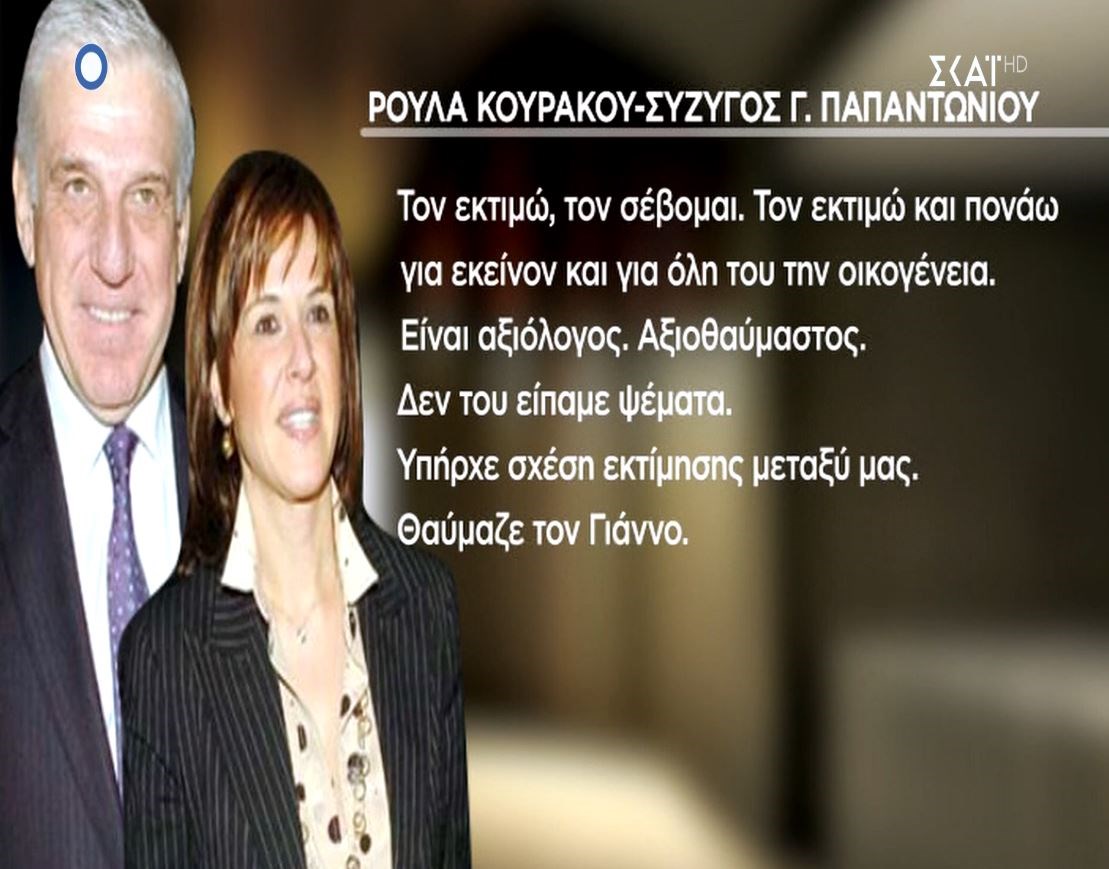 “Είναι τραγικά όλα αυτά συμβαίνουν. Ο Γιάννος Παπαντωνίου είναι ένας ακέραιος άνθρωπος. Έχει ασκήσει διοίκηση αξιοκρατικά. Ποτέ δεν μπήκε σε τέτοιες διαδικασίες και πάντα έλεγαν για αυτόν: ‘Ο εύπορος τι δουλειά έχει στο ΠΑΣΟΚ;’ Ποτέ δεν μπήκε σε τέτοιες συνδιαλλαγές. Ο Γιάννος Παπαντωνίου είναι μια προσωπικότητα, που δεν μπορεί κανείς, ακόμη και σήμερα να την ξεπεράσει. Είναι αξεπέραστος. Είναι ένας κύριος. Ένας τζέντλεμαν. Στάθηκε στα παιδιά μου. Τα παιδιά μου, ακόμα και με όλα αυτά που τραβάμε τον έχουν πολύ ψηλά. Αυτό κάτι σημαίνει… Δεν μπορεί κανείς να τον τραυματίσει τον Γιάννο”.