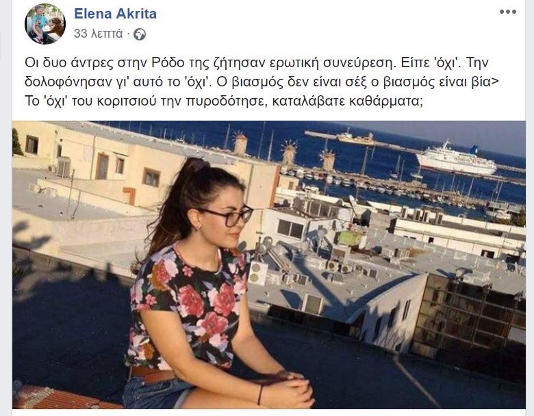 “Οι δυο άντρες στην Ρόδο της ζήτησαν ερωτική συνεύρεση. Είπε ‘όχι’. Την δολοφόνησαν γι’ αυτό το ‘όχι’. Ο βιασμός δεν είναι σεξ ο βιασμός είναι βία> Το ‘όχι’ του κοριτσιού την πυροδότησε, καταλάβατε καθάρματα;”.