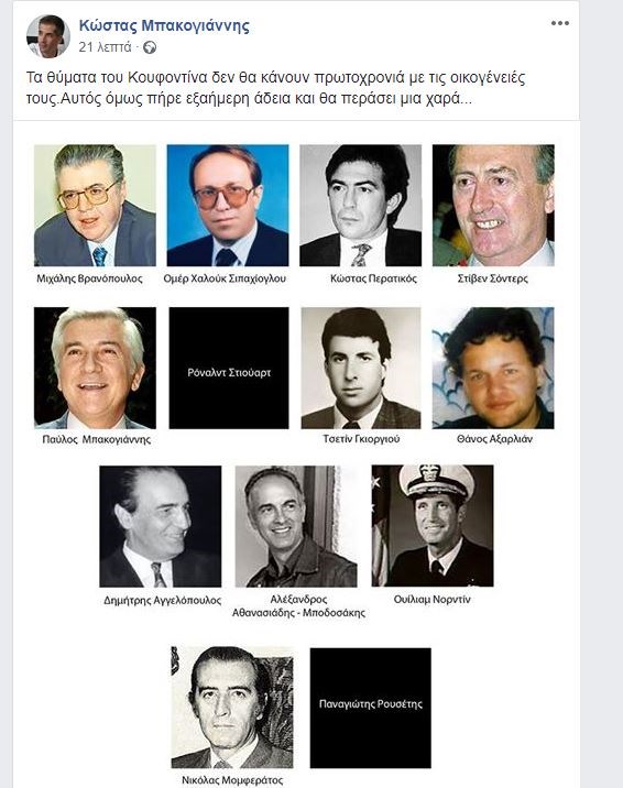Την έντονη αντίδραση του περιφερειάρχη Στερεάς Ελλάδας και υποψήφιου Δημάρχου Αθηναίων Κώστα Μπακογιάννη προκάλεσε η απόφαση να χορηγηθεί νέα άδεια στον Δημήτρη Κουφοντίνα. “Τα θύματα του Κουφοντίνα δεν θα κάνουν πρωτοχρονιά με τις οικογένειές τους.Αυτός όμως πήρε εξαήμερη άδεια και θα περάσει μια χαρά…” έγραψε ο Κώστας Μπακογιάννης στο Facebook, συνοδεύοντας την ανάρτησή του με μια φωτογραφία από τα θύματα του αρχιεκτελεστή της 17 Νοέμβρη. Ανάμεσα σε αυτά, και ο πατέρας του, Παύλος Μπακογιάννης….
