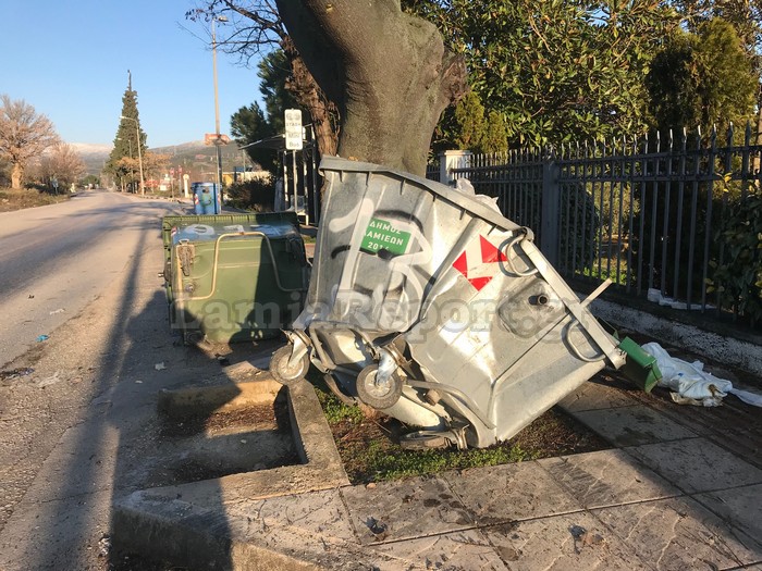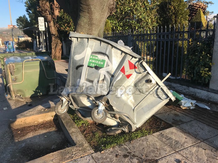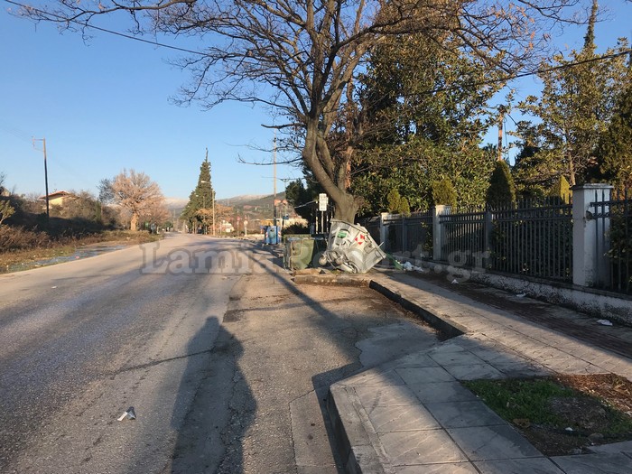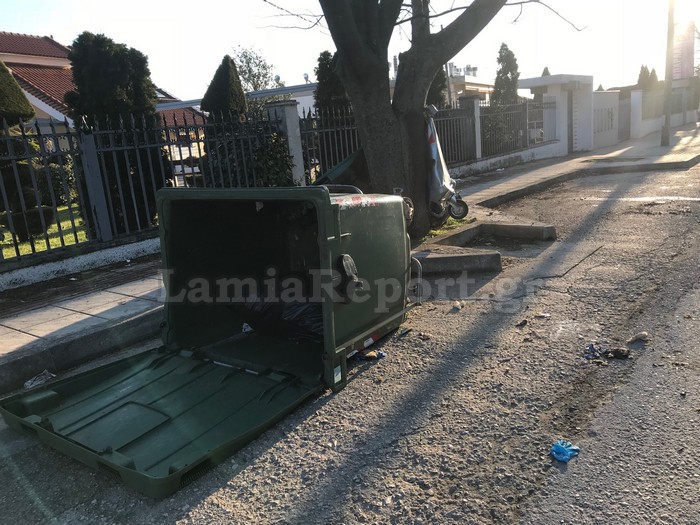 Ένας κάδος «κολλημένος» σε δέντρο και ένας ακόμη πεσμένος, ήταν η εικόνα που αντίκριζε κανείς το πρωί της Κυριακής στο δρόμο προς το Νοσοκομείο Λαμίας στην οδό Λαρίσης πριν την Αλύτρωτων Πατρίδων.