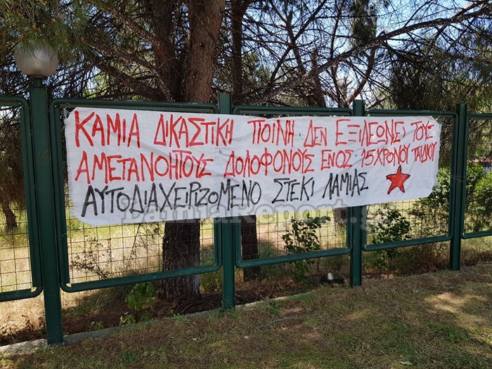 Στο Δικαστήριο παραβρέθηκαν και μέλη της συλλογικότητας «Αυτοδιαχειριζόμενο Στέκι Λαμίας», οι οποίοι με την ευκαιρία του πρώτου διαλείμματος της διαδικασίας ανάρτησαν πανό έξω από το κτίριο που έγραφε: «Καμία δικαστική ποινή δεν εξιλεώνει τους αμετανόητους δολοφόνους ενός 15χρονου παιδιού», απαντώντας ουσιαστικά στα όσα υποστήριξε η υπεράσπιση του κατηγορουμένου.