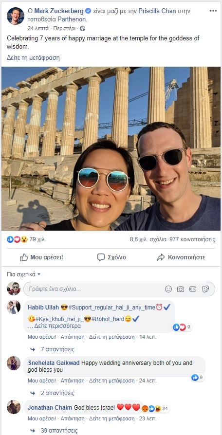 Στην Ελλάδα βρίσκεται με τη σύζυγό του, ο ιδρυτής του Facebook Μαρκ Ζούκερμπεργκ.Με αφορμή μάλιστα την έβδομη επέτειο του γάμου τους, το ζευγάρι επισκέφθηκε την Ακρόπολη.Ο πολυεκατομμυριούχος ανέβασε μια selfie των δύο τους μπροστά από τον Παρθενώνα, γράφοντας στη λεζάντα: «Γιορτάζοντας επτά χρόνια ευτυχισμένου γάμου στο ναό της θεάς της σοφίας».Δείτε τη φωτογραφία: