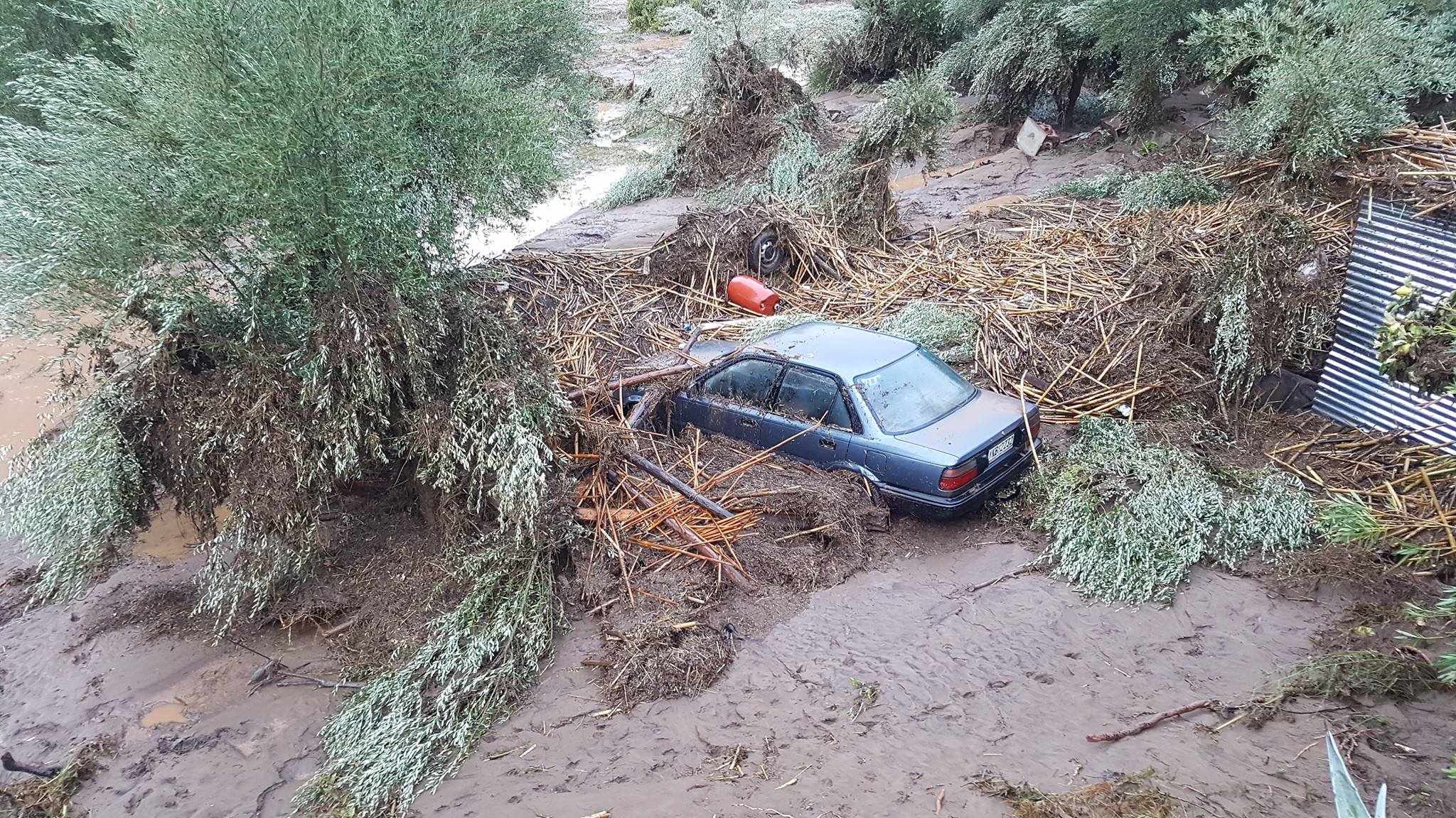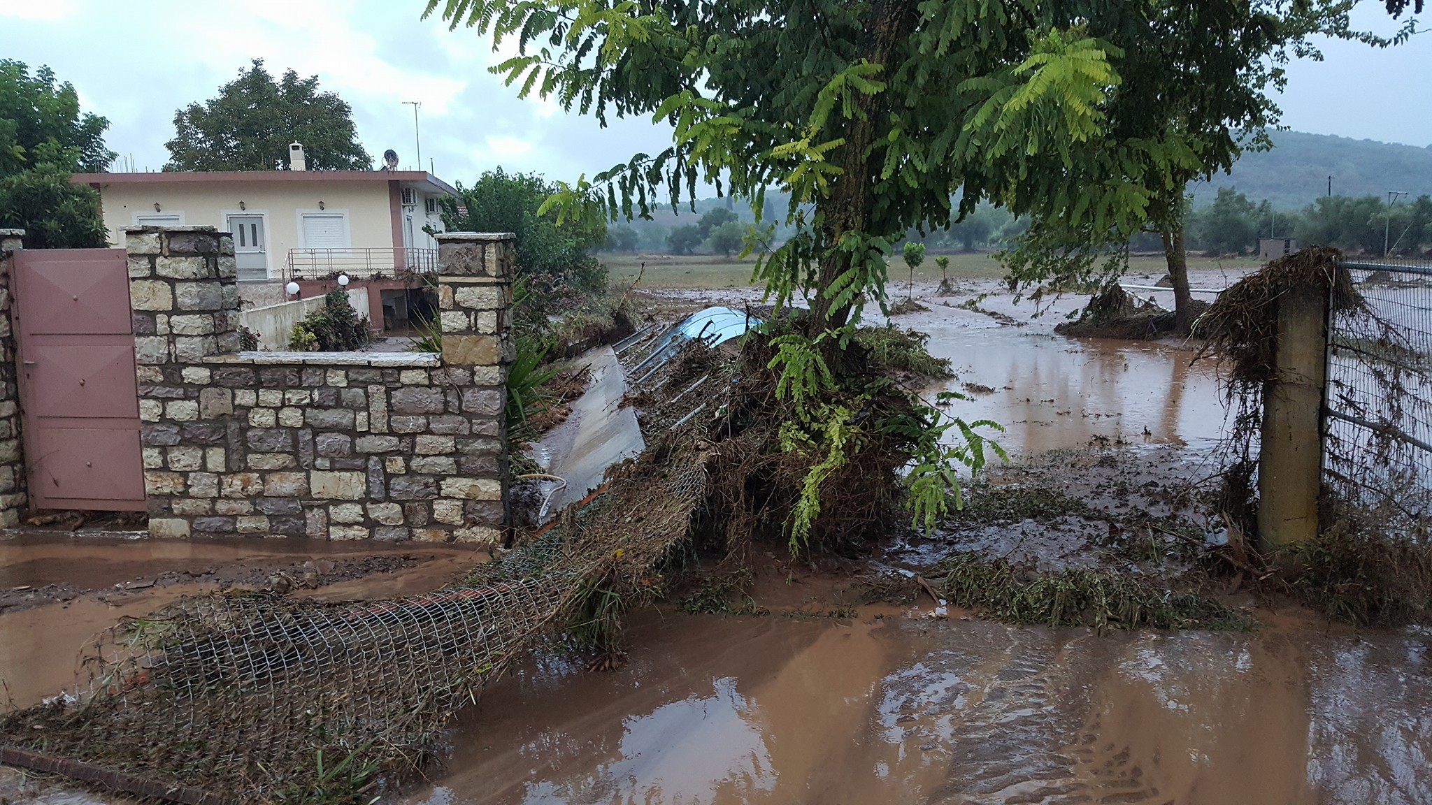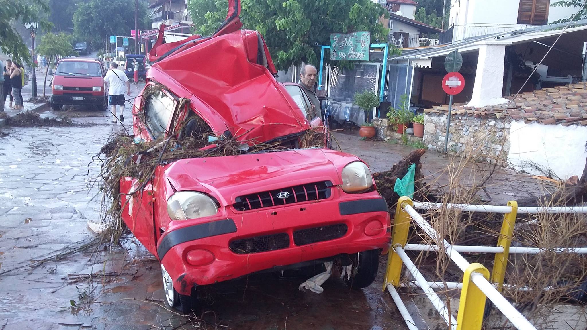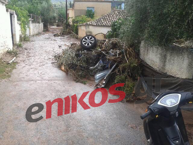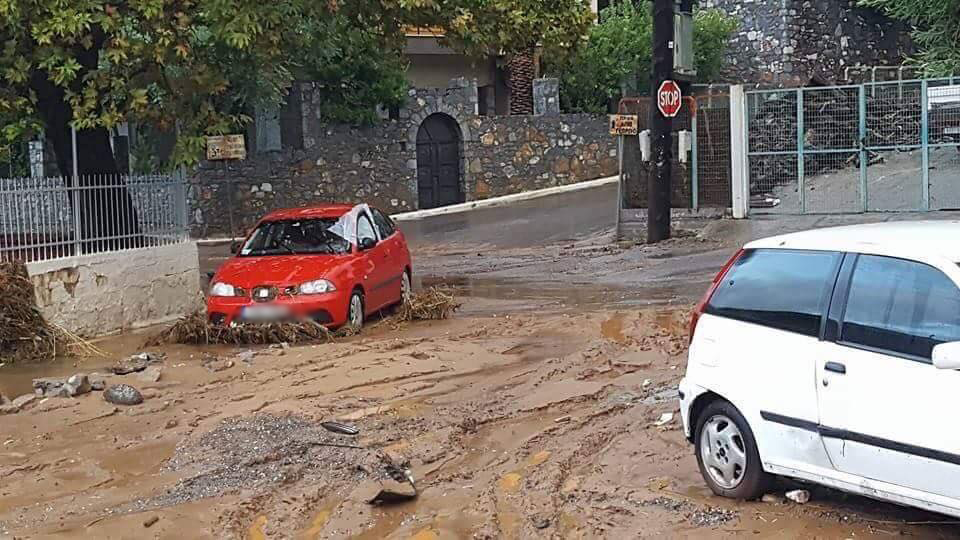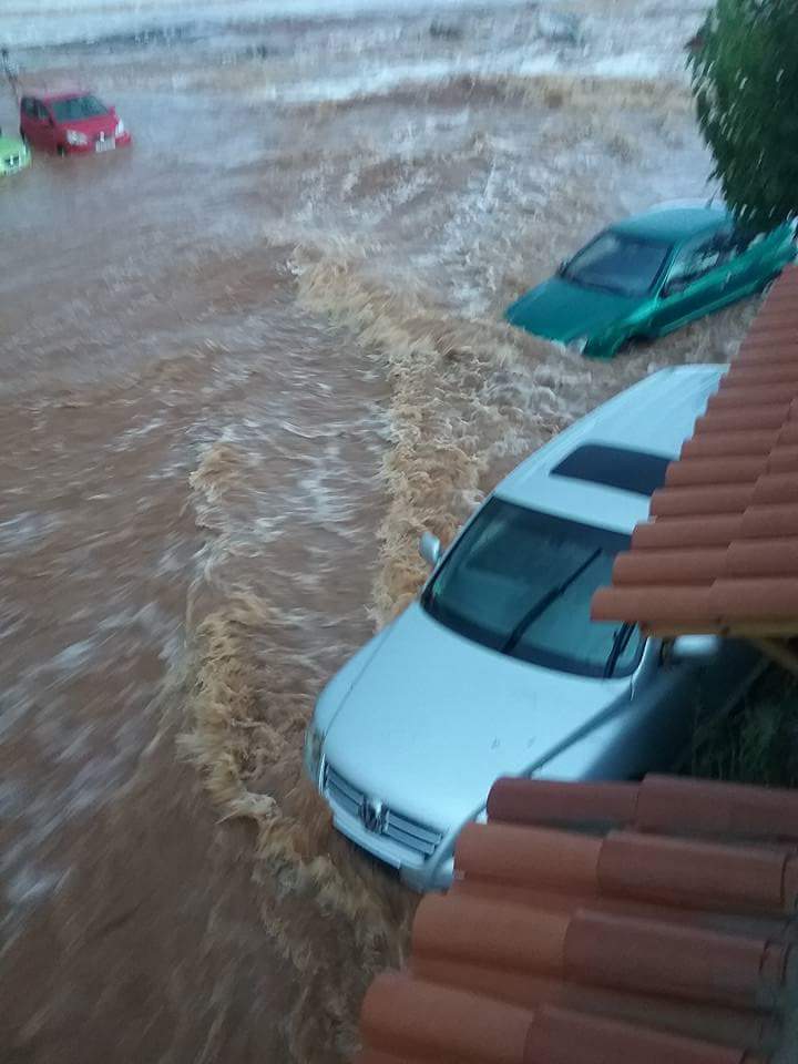 Οι δρόμοι είναι πλημμυρισμένοι, αυτοκίνητα έχουν αναποδογυρίσει ενώ μπάζα και ξύλα που παρέσυραν τα ορμητικά νερά έχουν κατακλύσει τις αυλές των σπιτιών.