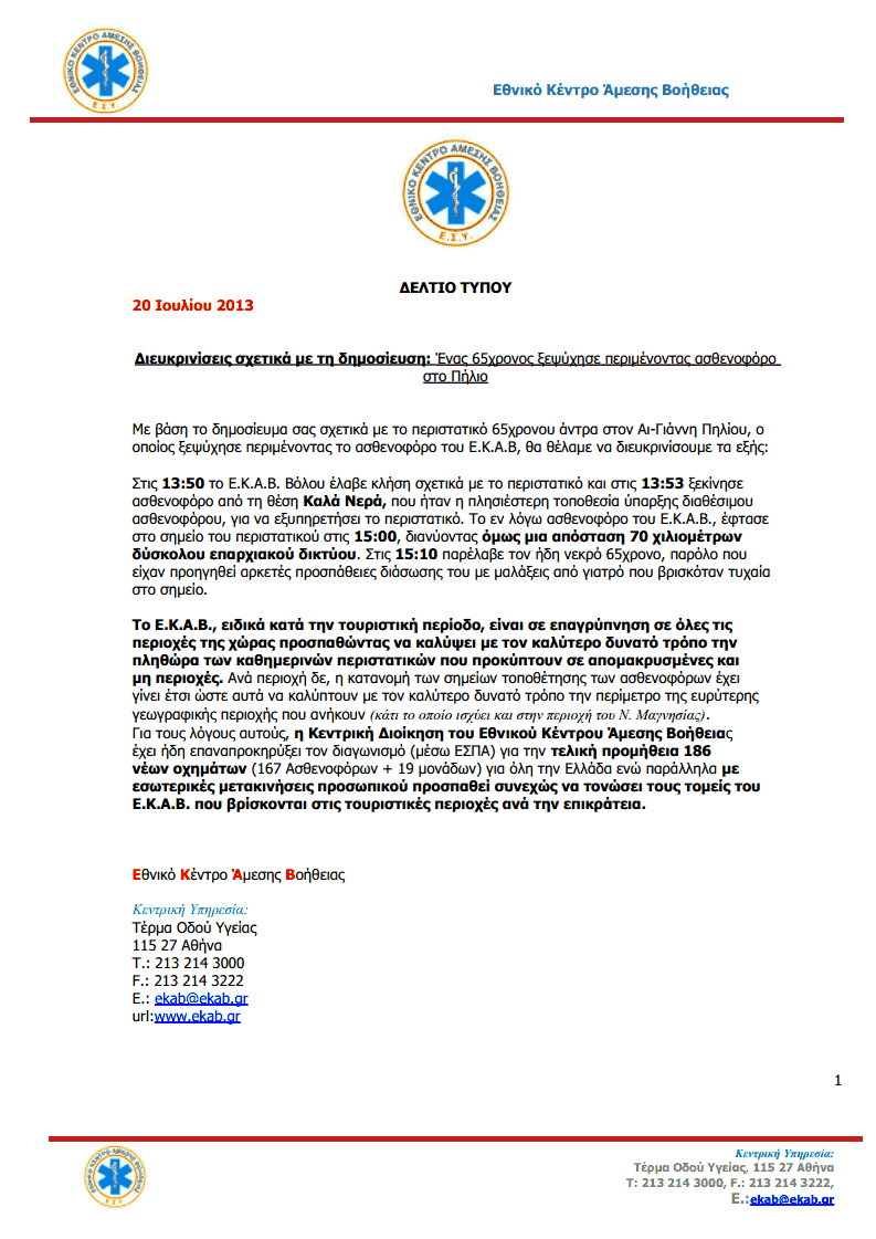 Η Κεντρική Υπηρεσία του Εθνικού Κέντρου Άμεσης Βοήθειας (ΕΚΑΒ), εξέδωσε διευκρινιστική ανακοίνωση για το συμβάν:
