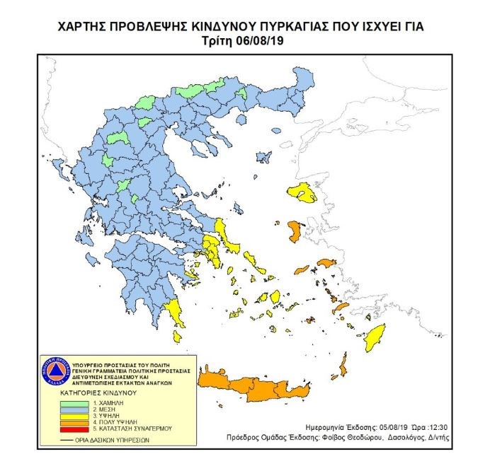 Πολύ υψηλός κίνδυνος πυρκαγιάς προβλέπεται για αύριο Τρίτη 6 Αυγούστου 2019, σύμφωνα με το Χάρτη Πρόβλεψης Κινδύνου Πυρκαγιάς που εκδίδει η Γενική Γραμματεία Πολιτικής Προστασίας του Υπουργείου Εσωτερικών & Διοικητικής Ανασυγκρότησης (www.civilprotection.gr).