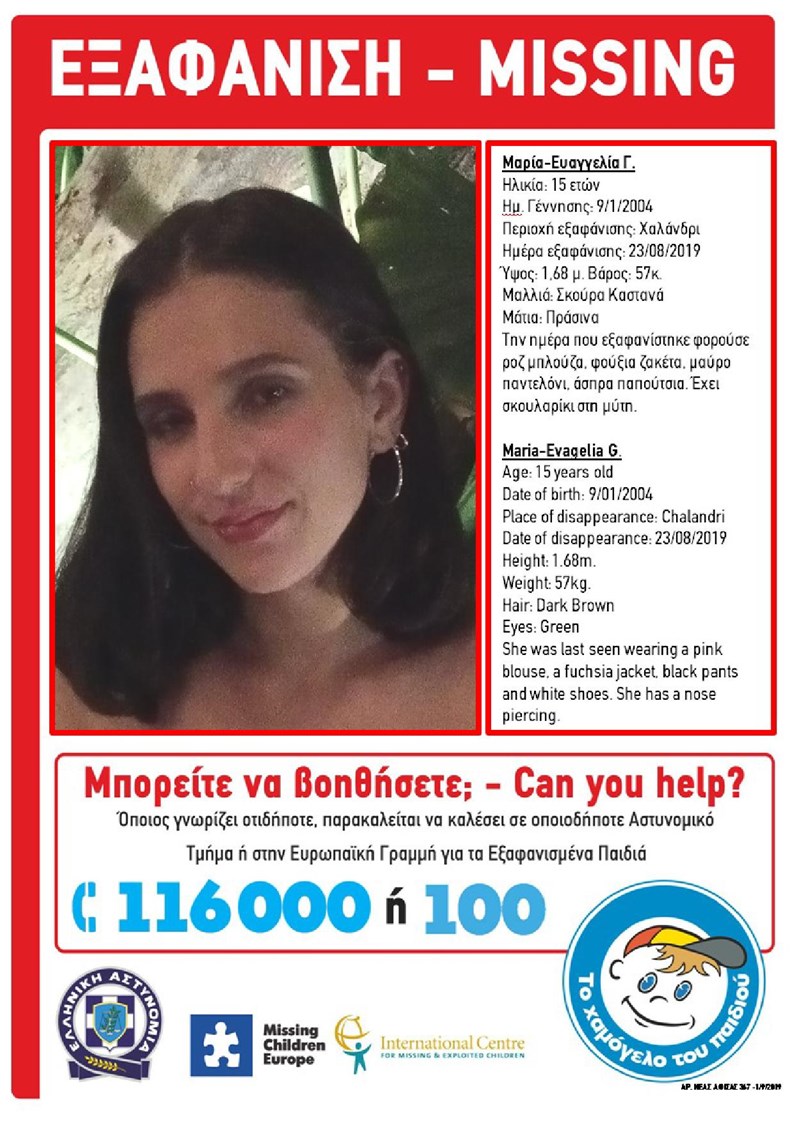 Συναγερμός έχει σημάνει στις Αρχές για την εξαφάνιση μιας 15χρονης από την περιοχή του Χαλανδρίου. Η Μαρία-Ευαγγελία Γ. αγνοείται από τις 23 Αυγούστου.