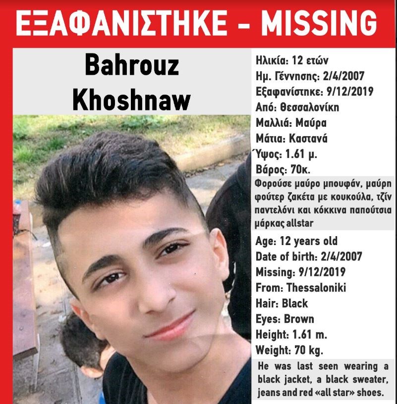 Στις 09/12/2019, και ώρα 09:00, εξαφανίστηκε από την πόλη της Θεσσαλονίκης, ο Bahrouz Khoshnaw 12 ετών. Για την εν λόγω εξαφάνιση, ενημερώθηκε σήμερα το Χαμόγελο του Παιδιού.