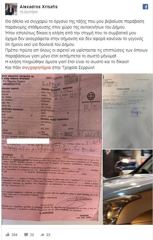 Κλήση για παράνομο παρκάρισμα πήρε την περασμένη Πέμπτη στις Σέρρες ο Δήμαρχος της πόλης, Αλέξανδρος Χρυσάφης με το ενδιαφέρον να εντοπίζεται στον τρόπο που αντέδρασε.Συγκεκριμένα, ο κ. Χρυσάφης πάρκαρε με το συμβατικό του αυτοκίνητο σε χώρο, όπου επιτρέπεται η στάθμευση μόνο υπηρεσιακών οχημάτων. Η Τροχαία πέρασε και του έκοψε κλήση με τον Δήμαρχο Σερρών να πληρώνει το πρόστιμο των 40 ευρώ και να δίνει συγχαρητήρια στις Αρχές.«Θα ήθελα να συγχαρώ το όργανο της τάξης που μου βεβαίωσε παράβαση παράνομης στάθμευσης στον χώρο της αυτοκινήτων του Δήμου. Ήταν απολύτως δίκαια η κλήση από την στιγμή που το συμβατικό μου όχημα δεν αναγράφεται στην σήμανση και δεν αφορά κανέναν το γεγονός ότι ήμουν εκεί για δουλειά του Δήμου» τονίζει σε δημοσίευσή του στο Facebook.
