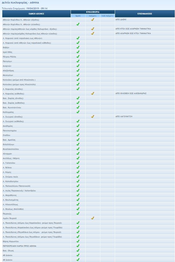 Σύμφωνα με την ενημέρωση από την Τροχαία αυξημένη κίνηση παρατηρείται στα εξής σημεία: Αθηνών-Κορίνθου/Λ. Αθηνών (έξοδος) από Δαφνί, Αθηνών – Λαμίας (Αθηνών έως κόμβος Καλυφτάκη -έξοδος) από ΚΤΕΛ έως Αχαρνών τμηματικά, Αθηνών – Λαμίας (κόμβος Καλυφτάκη έως Αθηνών – είσοδος) από Αχαρνών έως ΚΤΕΛ τμηματικά, Λ. Κηφισίας (κάθοδος) από Φιλοθέη έως Αλεξάνδρας, Λ. Συγγρού (άνοδος) από Λαγουμιτζή, Λιμάνι Πειραιά.