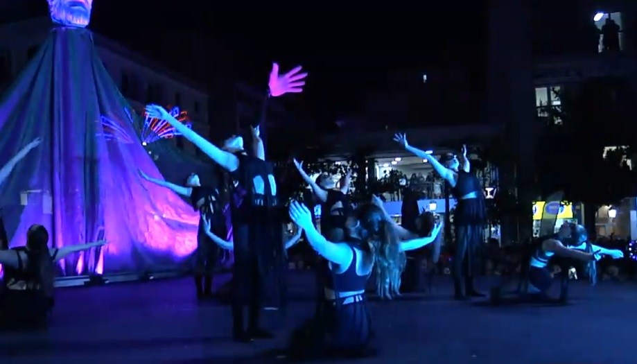 Η τελετή ξεκίνησε με δύο πομπές μεταμφιεσμένων καρναβαλιστών, οι οποίες έφθασαν στην πλατεία υπό του ήχους κρουστών, ενώ το καλλιτεχνικό κομμάτι είχε έντονους χορευτικούς ρυθμούς.