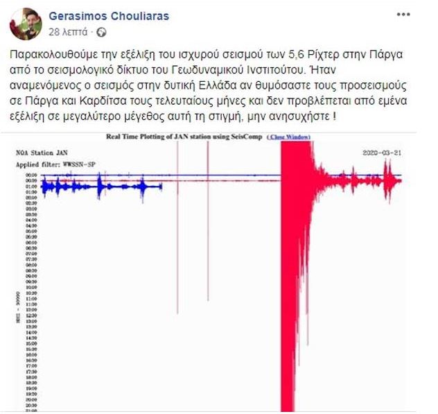 Καθησυχαστικός είναι ο σεισμολόγος Γεράσιμος Χουλιάρας με ανάρτηση του, τονίζοντας ότι σύμφωνα με τον ίδιο δεν προβλέπεται μεγαλύτερο μέγεθος αυτή τη στιγμή. Όπως σημειώνει ο Διευθυντής Ερευνών του Γεωδυναμικού Ινστιτούτου, σεισμολόγος, Γεράσιμος Χουλιάρας με ανάρτηση του στο Facebook, “ο σεισμός με βάση τους προσεισμούς σε Πάργα και Καρδίτσα τους τελευταίους μήνες, ήταν αναμενόμενος” ενώ καλεί καλεί τους πολίτες να μην ανησυχούν, αφού όπως σημειώνει “δεν προβλέπεται από εμένα εξέλιξη σε μεγαλύτερο μέγεθος αυτή τη στιγμή”.